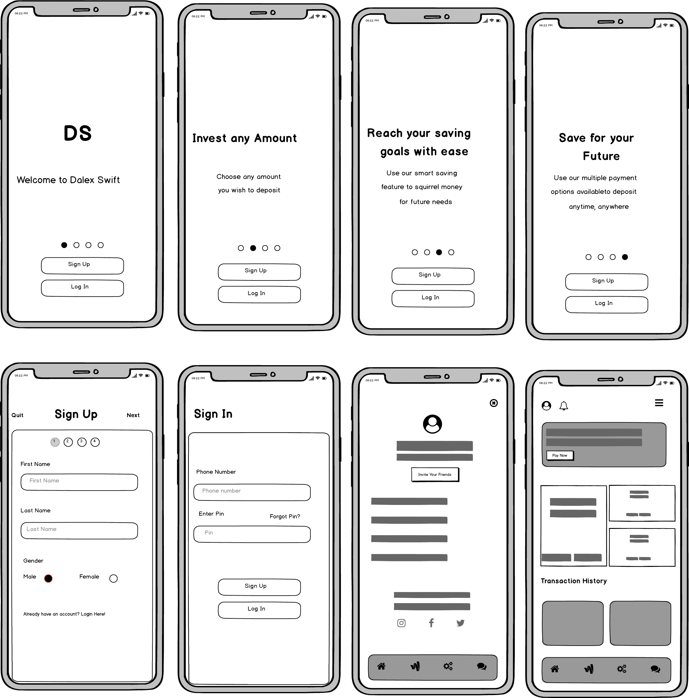 Moving ahead step-wise from sketches to low-fi wireframes to describe the flow of the app and the logical structure of the elements that defined the features of the application. each case was rapidly prototyped into wireframes so we can understand the flows and ultimately define the information architecture of the product.
